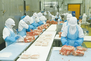 チルド輸送中に熟成されたブロック肉は、入荷直後に急速凍結され、国内の加工工場でスライス・盛り付けをしています。加工工場では定期的に立ち会い・監査を行い、規格・品質の確認を行っています。